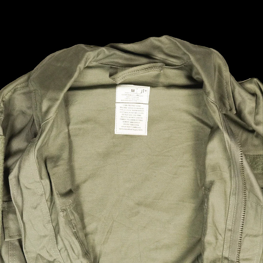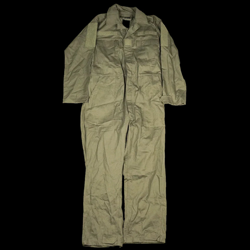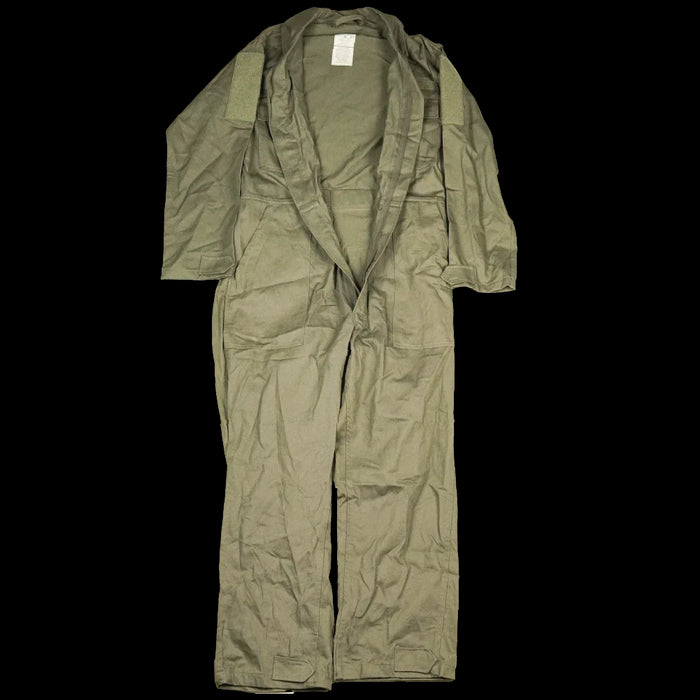 One-piece utility coveralls in a foliage green colourway. Military surplus garment in Used/Very Good condition with no defects noted in the provided information.