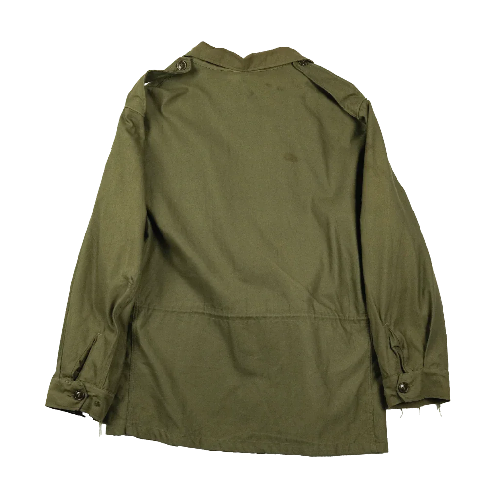 USGI M-1943 field jacket in surplus condition. This is the outer shell jacket only. It features a button-front closure and multiple front pockets typical of the M-1943 pattern.