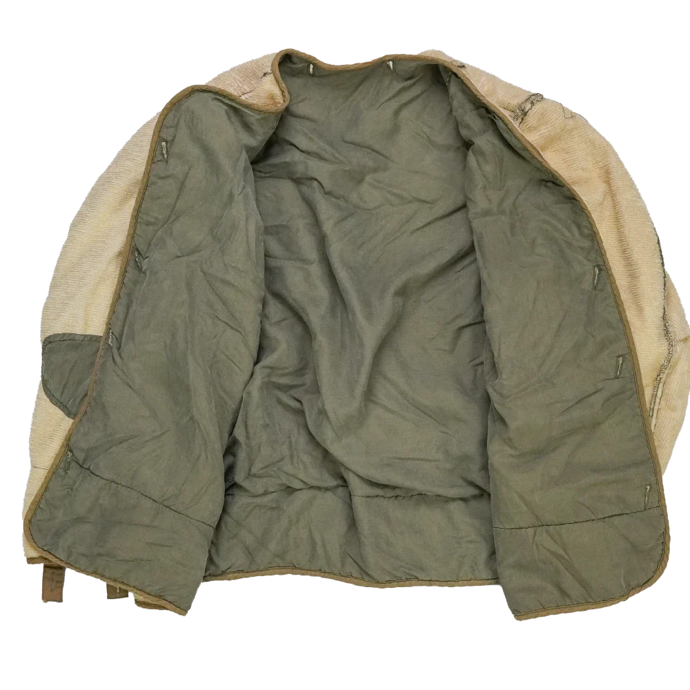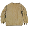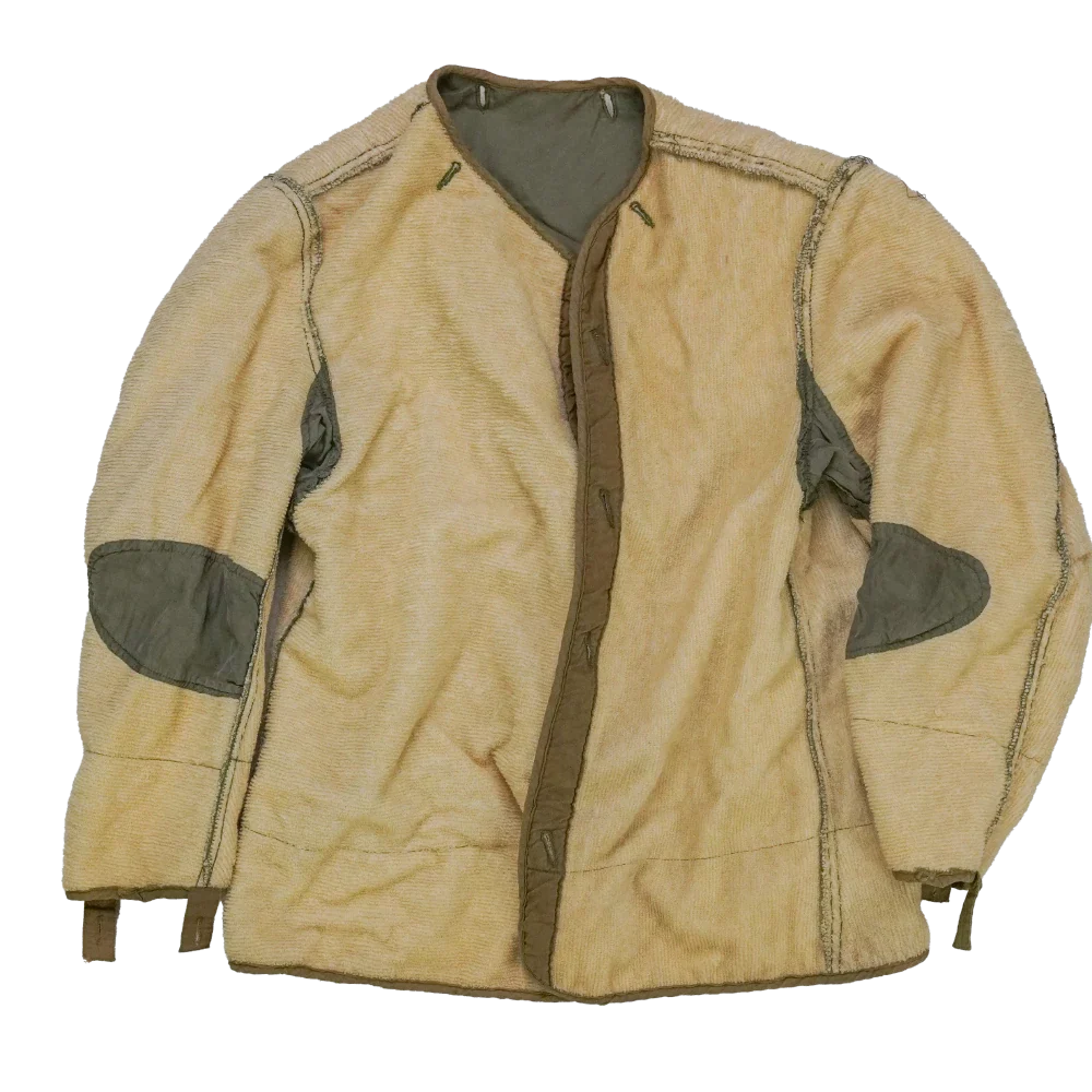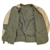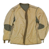 USGI M-1950 field jacket liner in medium sizing. Features a quilted-style outer with a soft pile texture, olive inner lining, and reinforced fabric panels at the elbows and underarms. Button attachment loops are present at the collar, cuffs, and hem for integration with an outer field jacket.