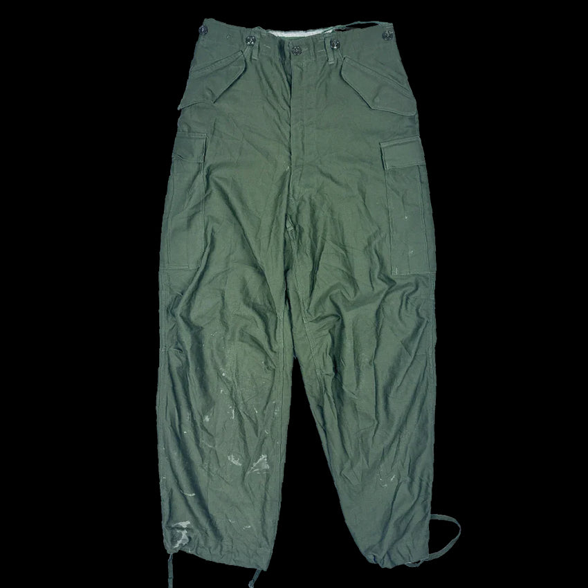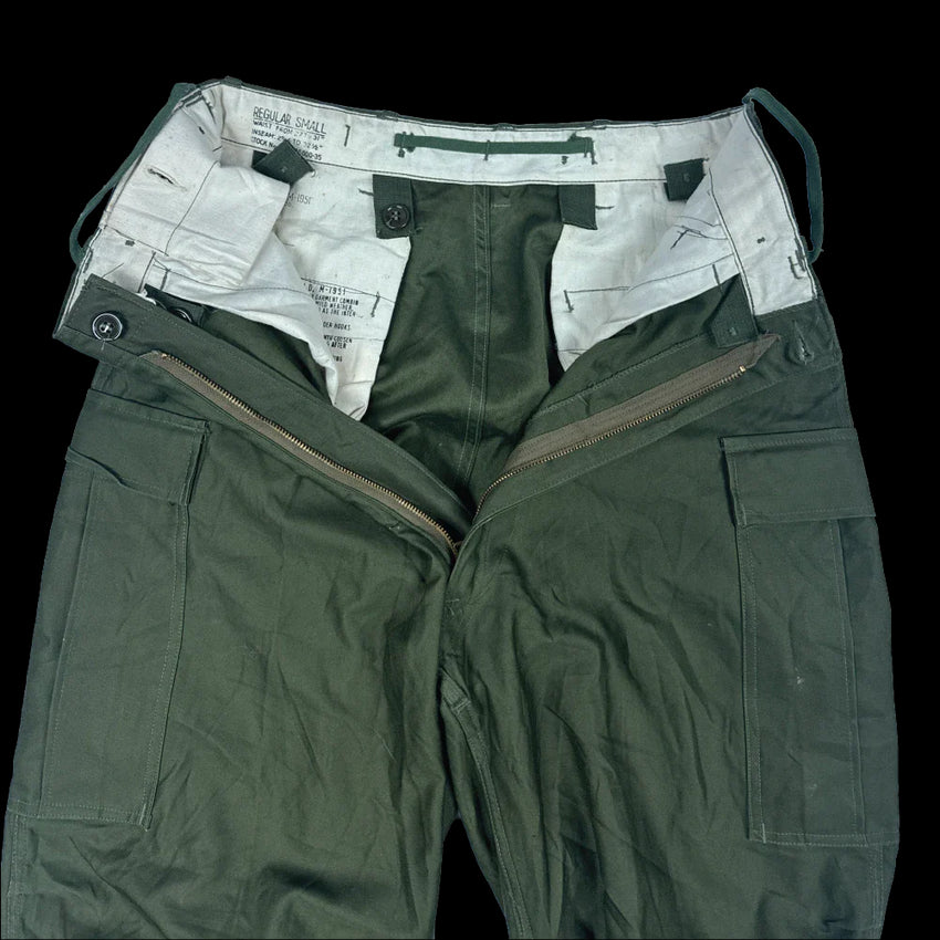 USGI M-1951 field shell trousers in Small Regular sizing. Shell-only trousers designed to accept cold weather liners. Features multiple pockets and suspender attachment points.