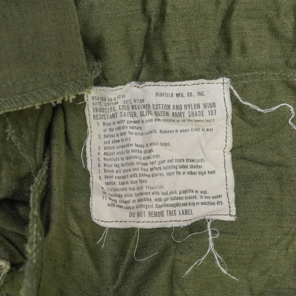 USGI M65 cold weather trousers in Small Regular sizing. Military surplus over-trousers designed for cold conditions, with a durable outer shell and full-length leg construction.