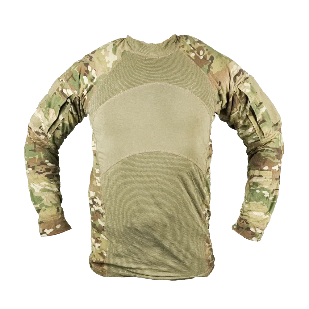 USGI UBAC shirt in OCP (Multicam) camouflage. Long-sleeve combat-style shirt with a mixed-fabric construction typical of UBAC garments.