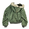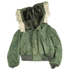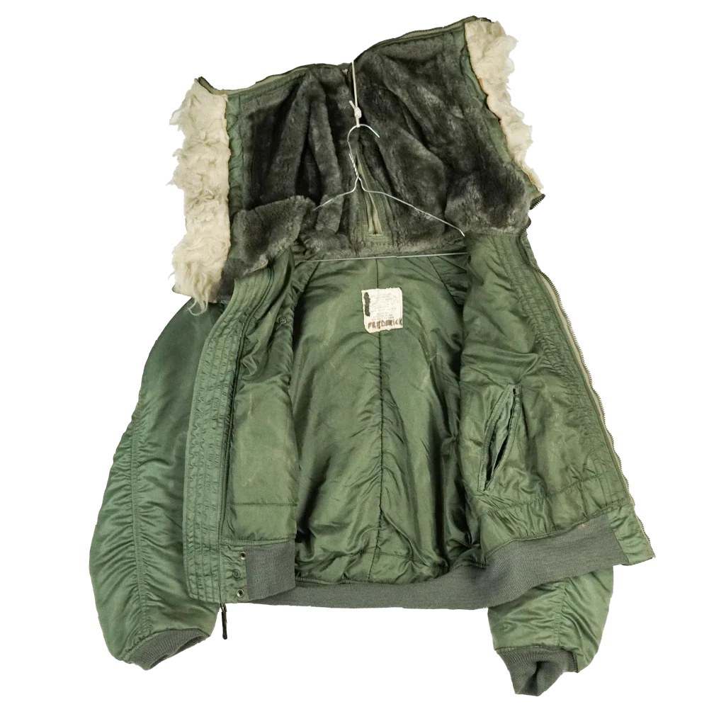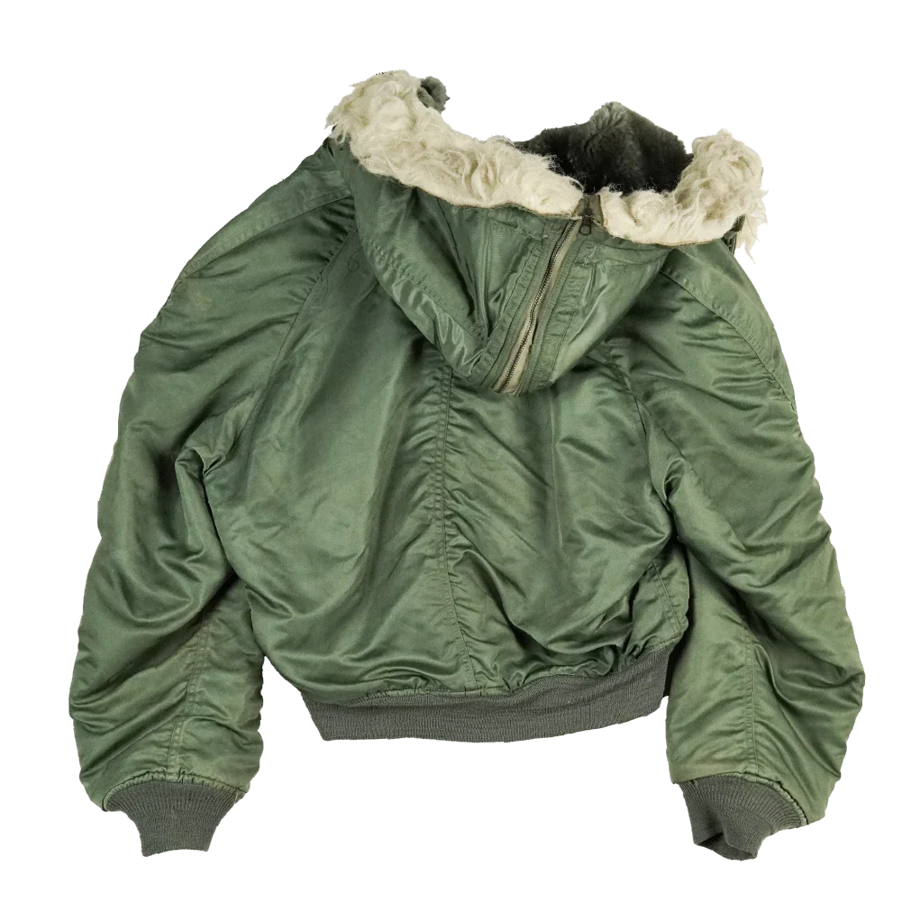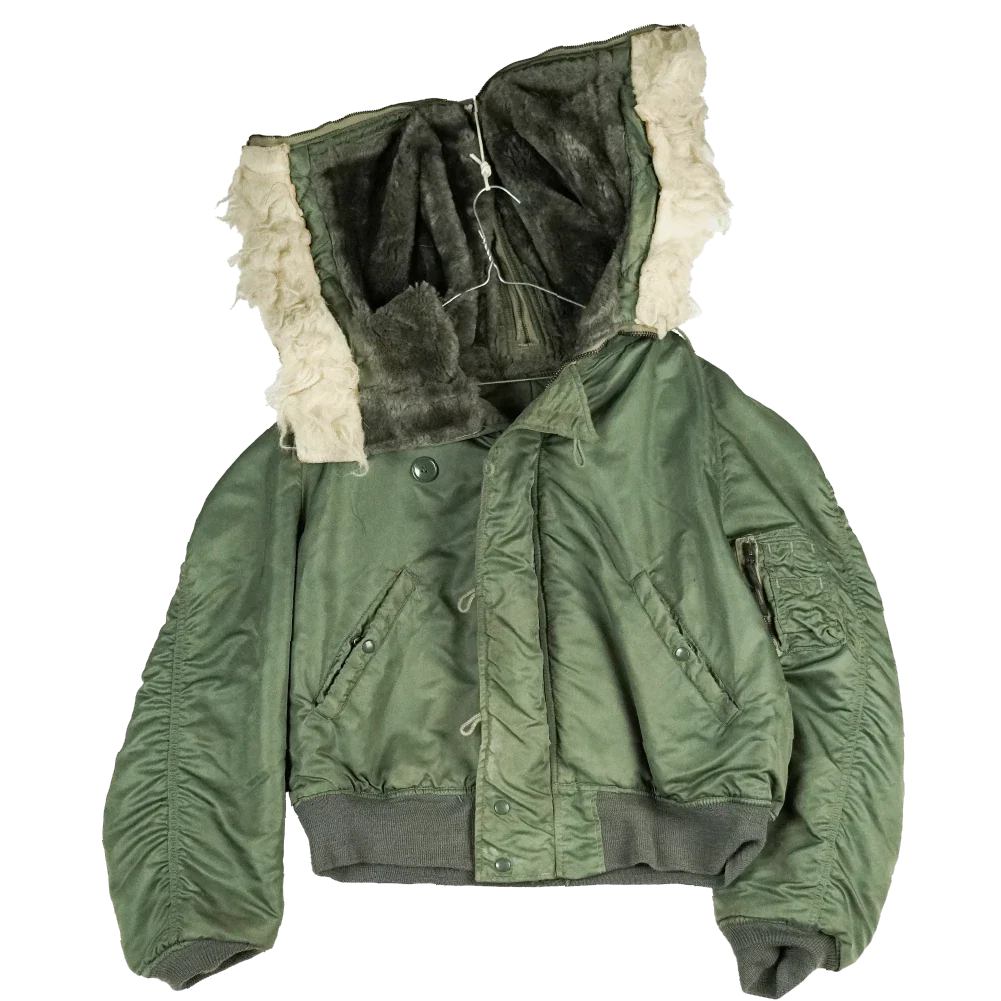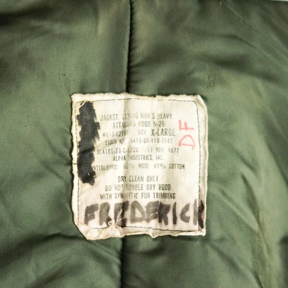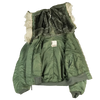 United States Government Issue N-2B Parka manufactured by Alpha Industries. Short-cut extreme cold weather flight parka with an insulated construction and snorkel-style hood. This example dates to 1977. One front button is missing.