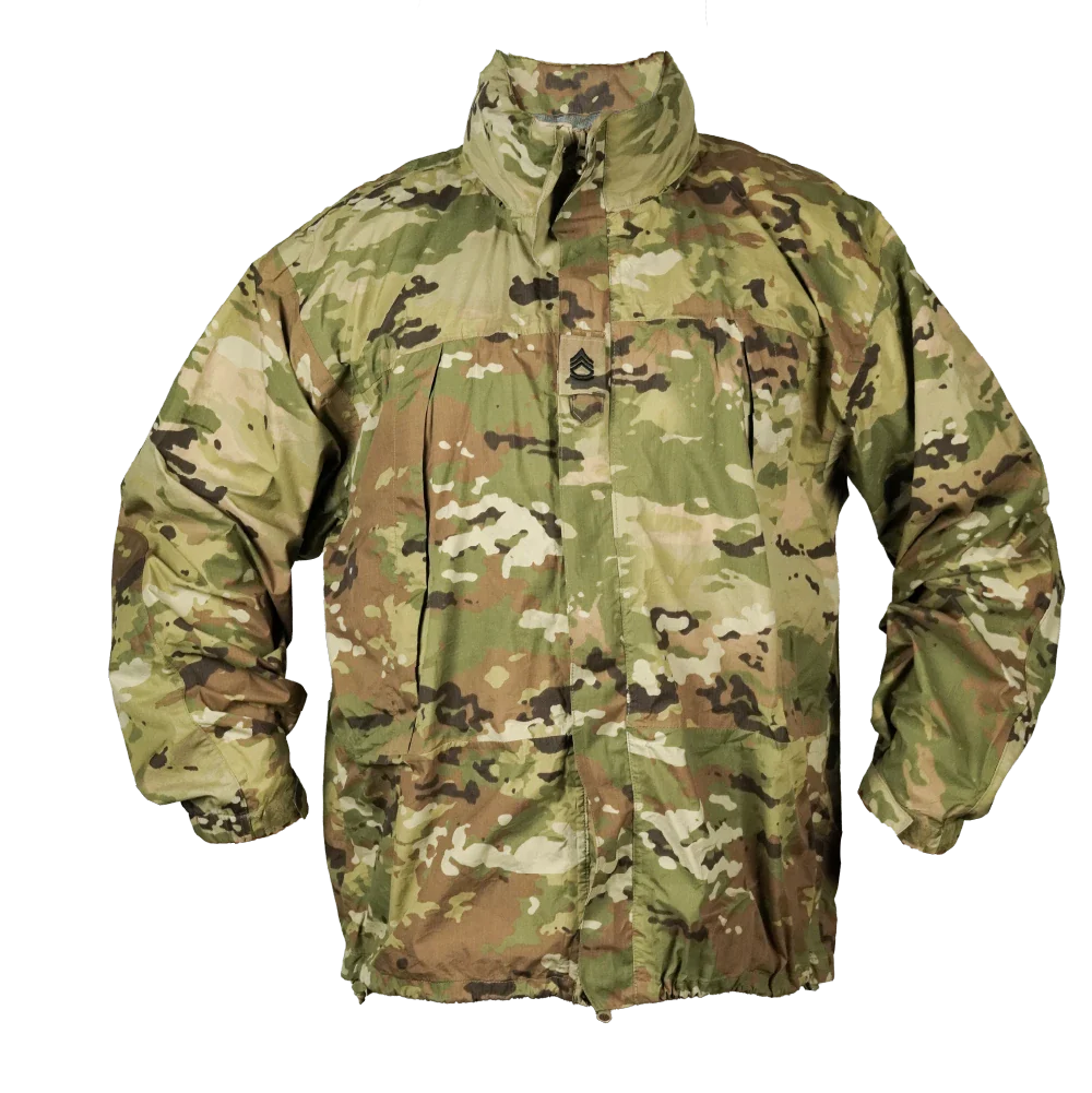 U.S. Government Issue ECWCS Gen III Layer 6 jacket in Operational Camouflage Pattern (OCP). This is a lightweight waterproof outer shell with a full front zip and storm flap, a high stand-up collar, and adjustment at the cuffs and hem.