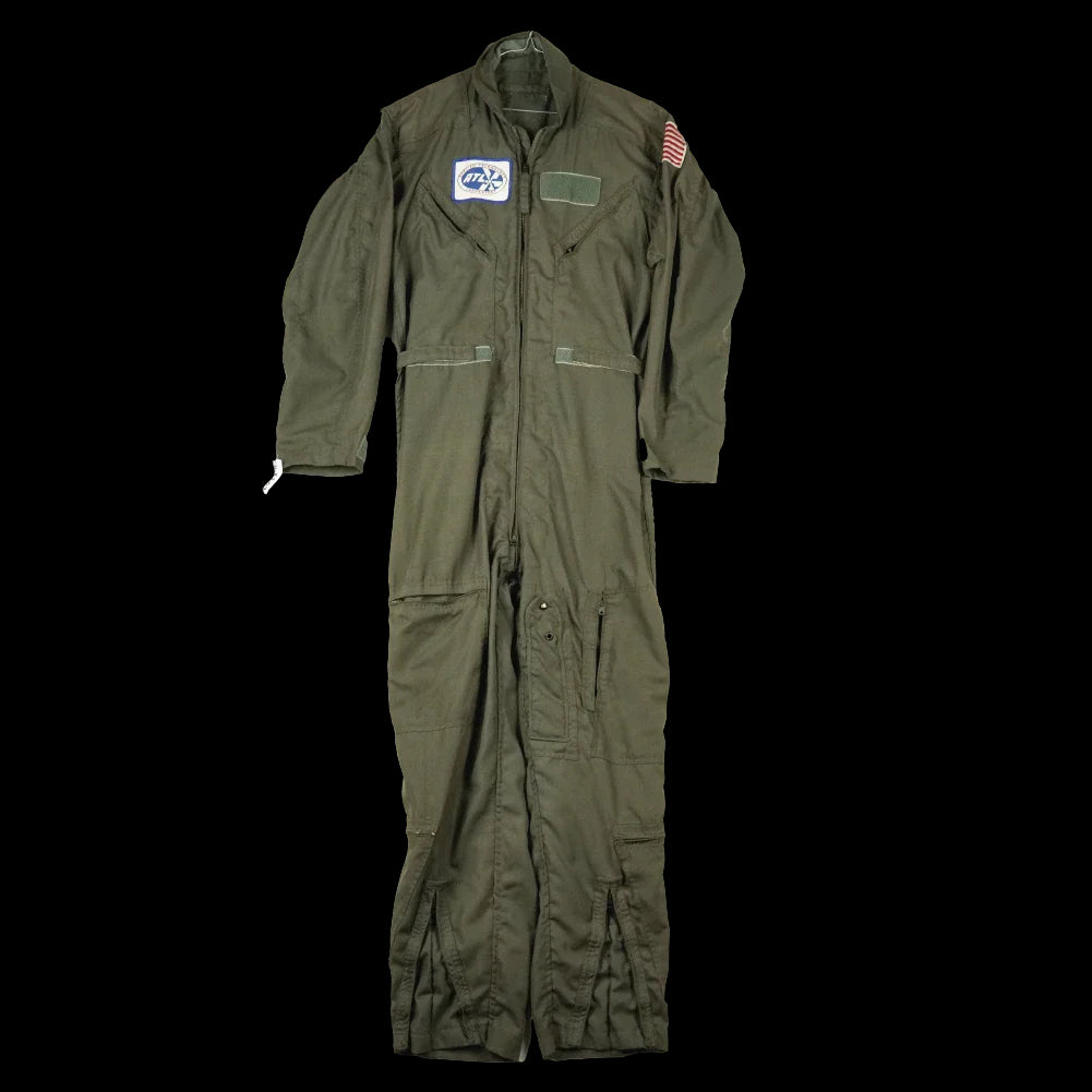 USGI pilot coveralls in a one-piece coverall construction. Features applied insignia including a USA flag patch on the left sleeve and an “Applied Technology Laboratory” logo on the chest.