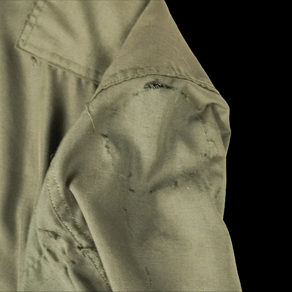 The collar lining is torn, and there is a tear at the location where a sleeve patch was removed.