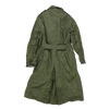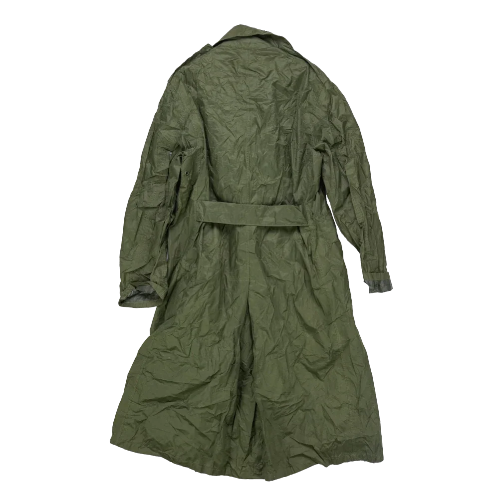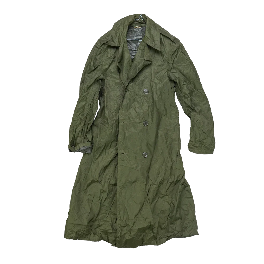 USGI rubber coated raincoat with a full-length protective design. The coat features a rubberised outer layer intended for wet weather protection and is dated 1973 manufacture.