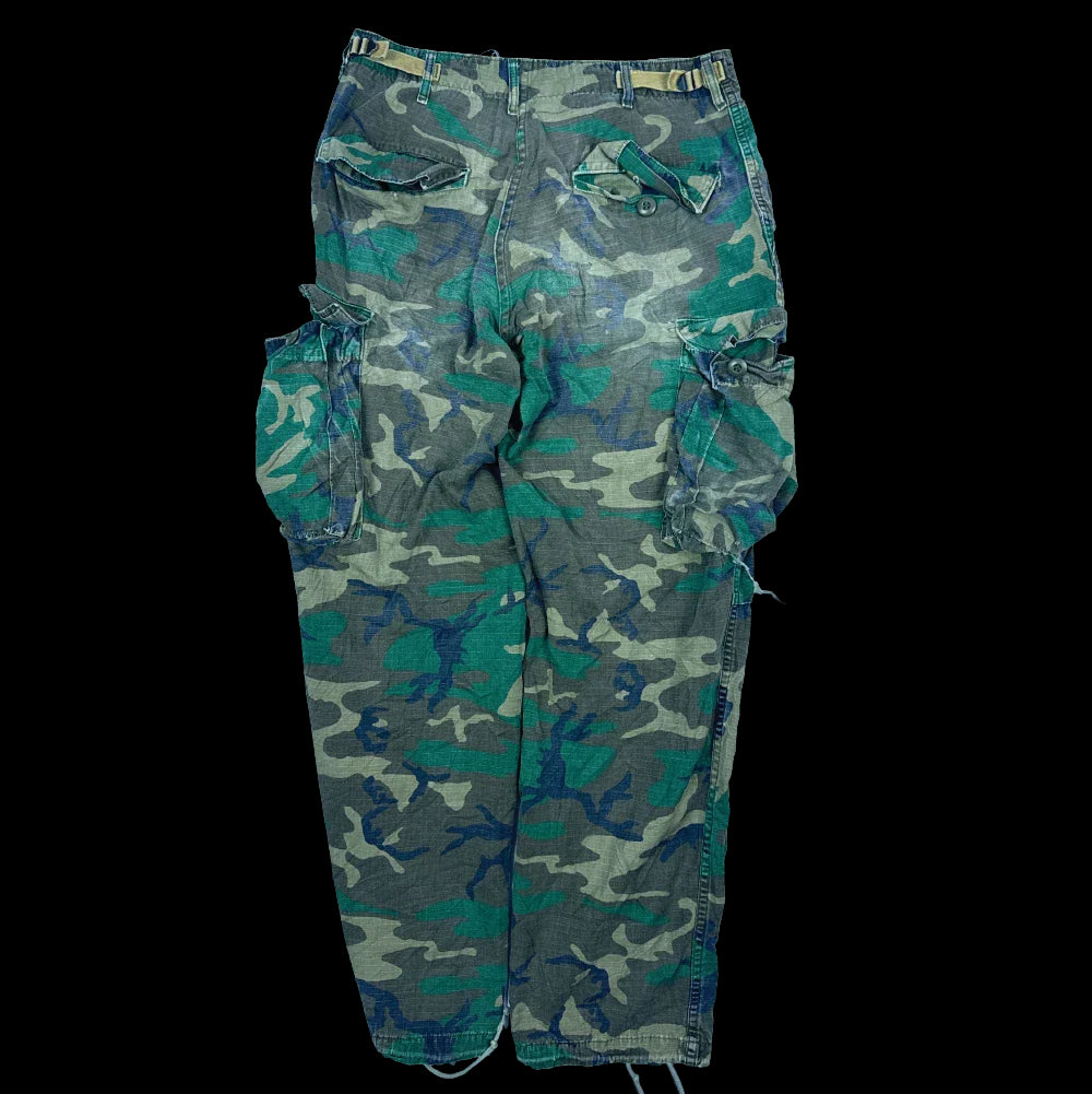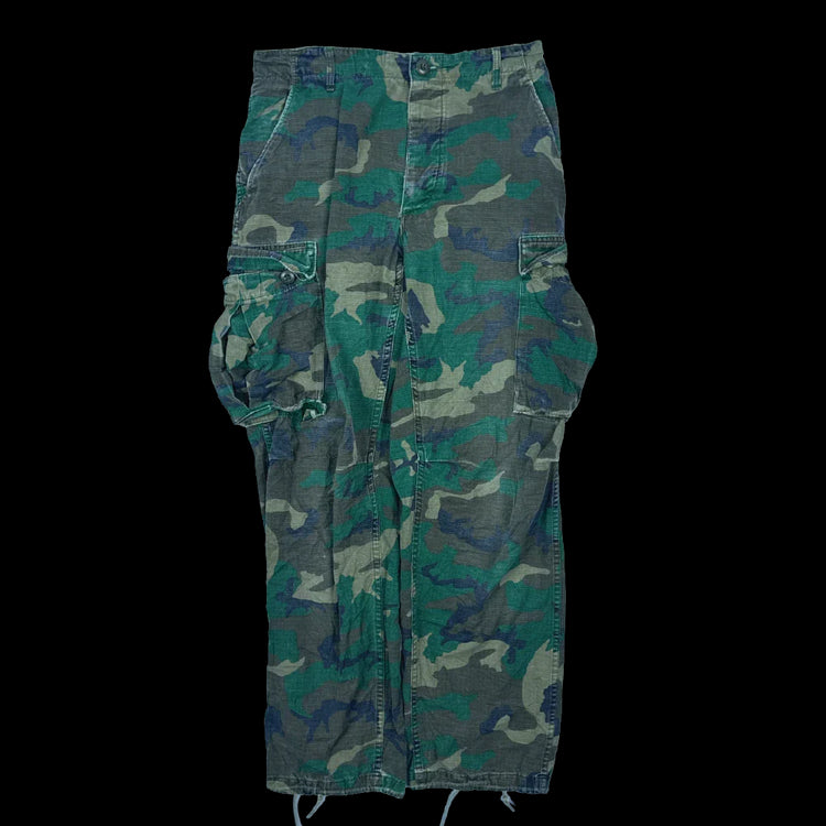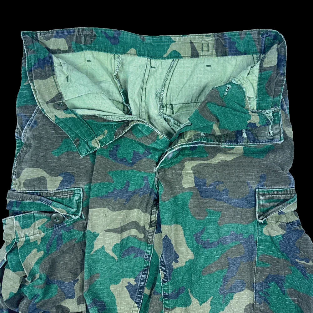 USGI RDF ERDL ripstop trousers in Small Regular size. Manufactured in 1980, featuring a ripstop construction with multiple pockets and adjustable fit details. There is fading on the backside and a hole in the bottom of the right cargo pocket.