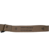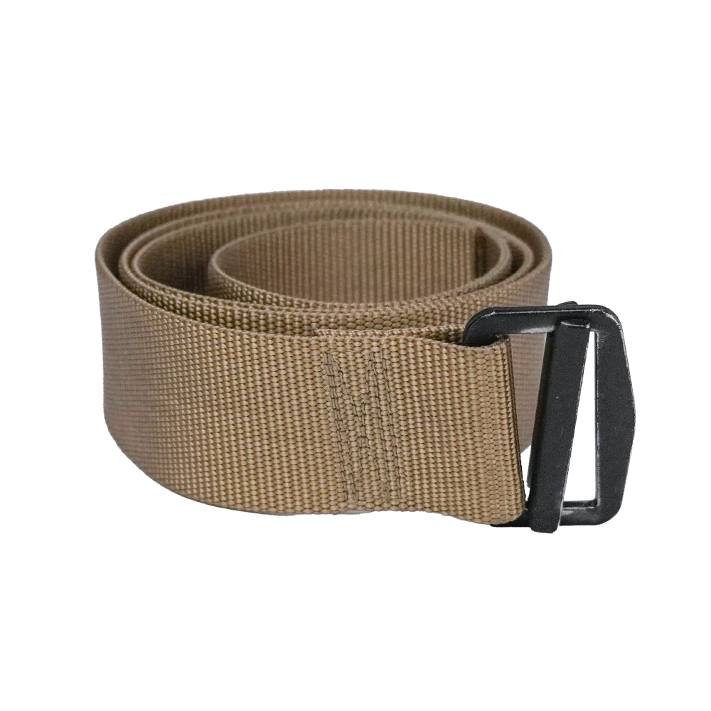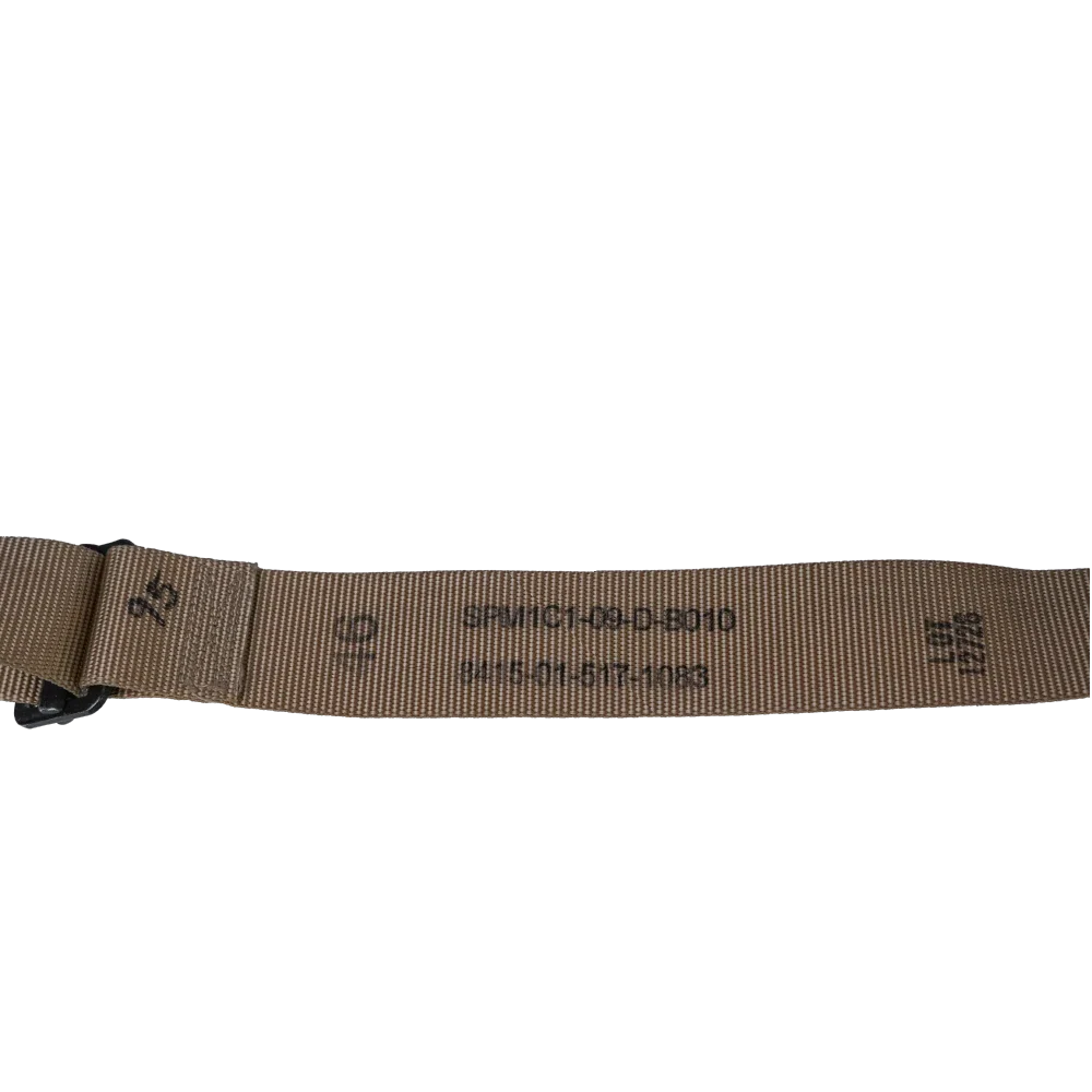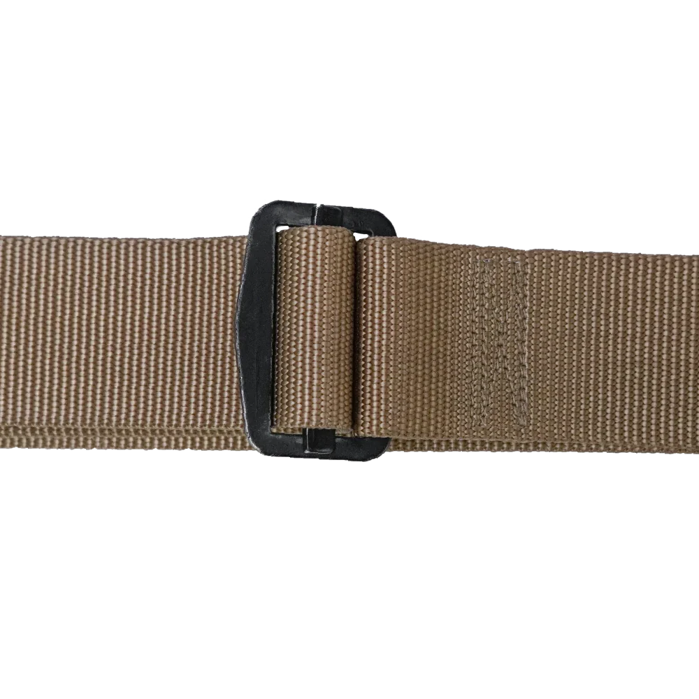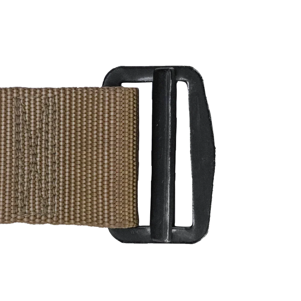 USGI tan trouser belt made from 100% nylon webbing. Features a tightly woven construction in a solid tan colour with reinforced stitching at the buckle attachment point.