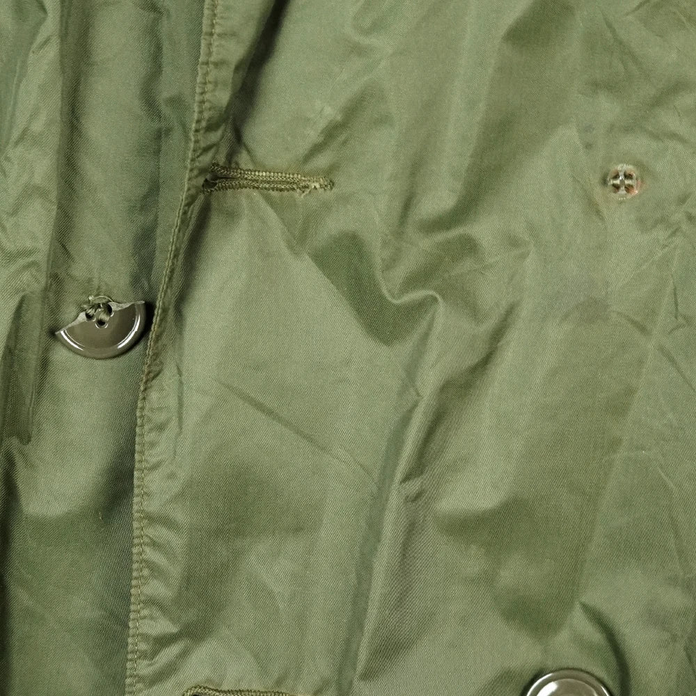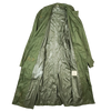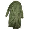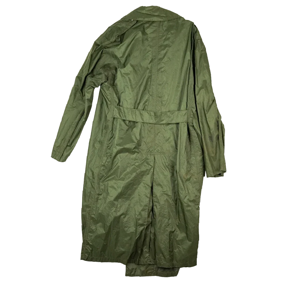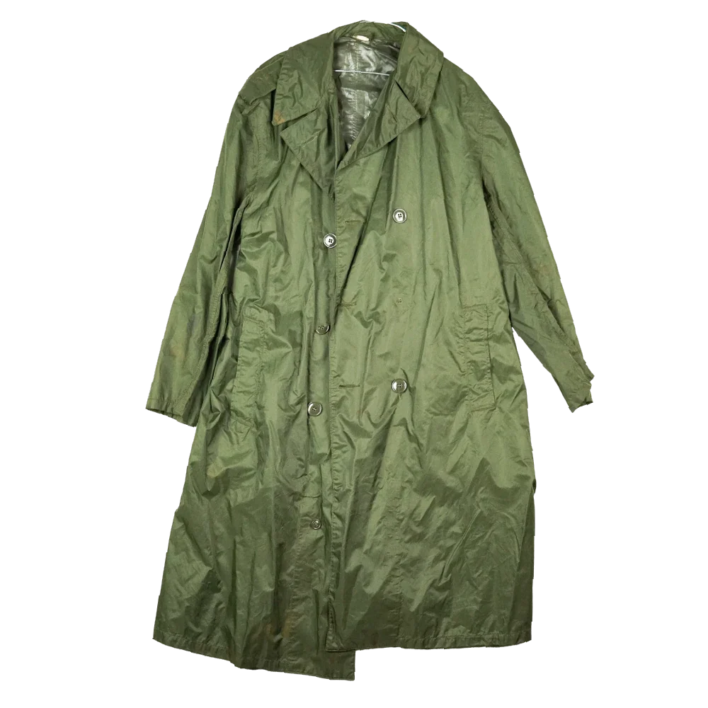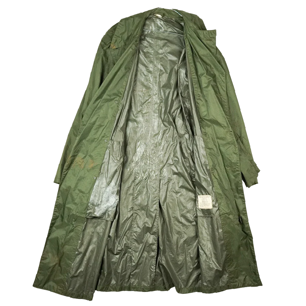 USGI rubber coated raincoat from the Vietnam era. Long cut coat with a button front closure.