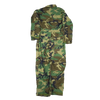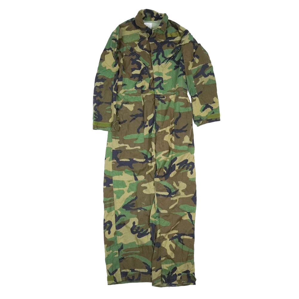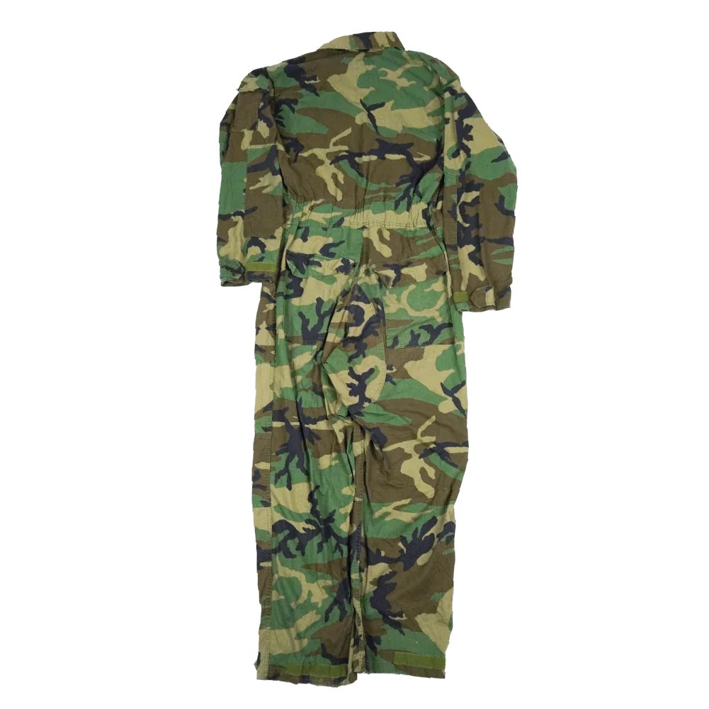 USGI mechanics coveralls in woodland camouflage pattern. Manufactured in 1996. One-piece coverall construction with multiple storage pockets and adjustable cuffs.