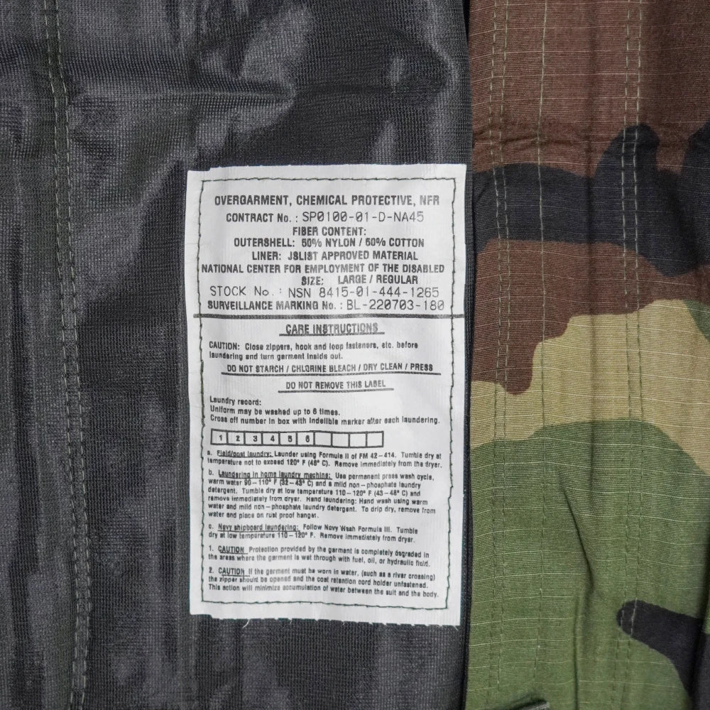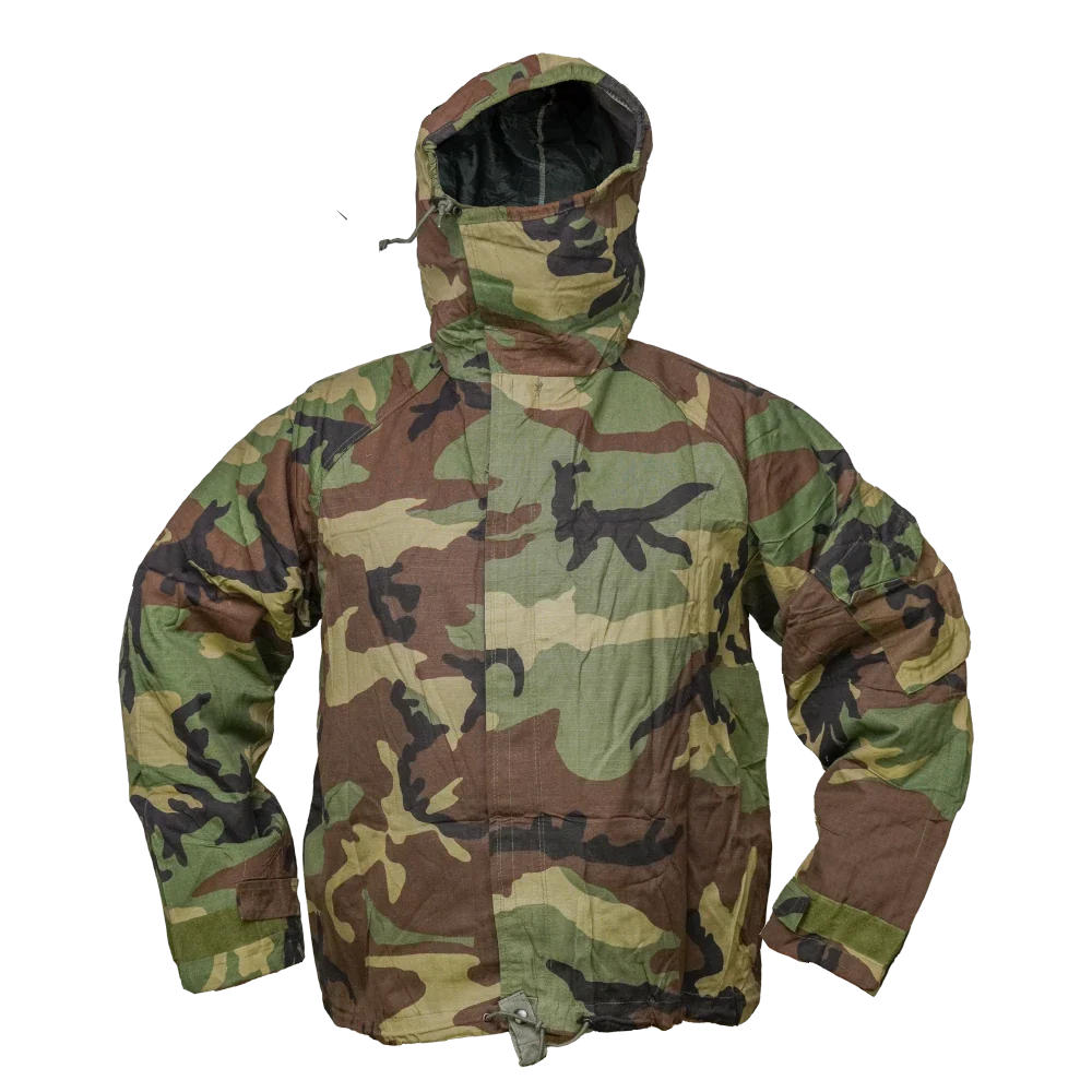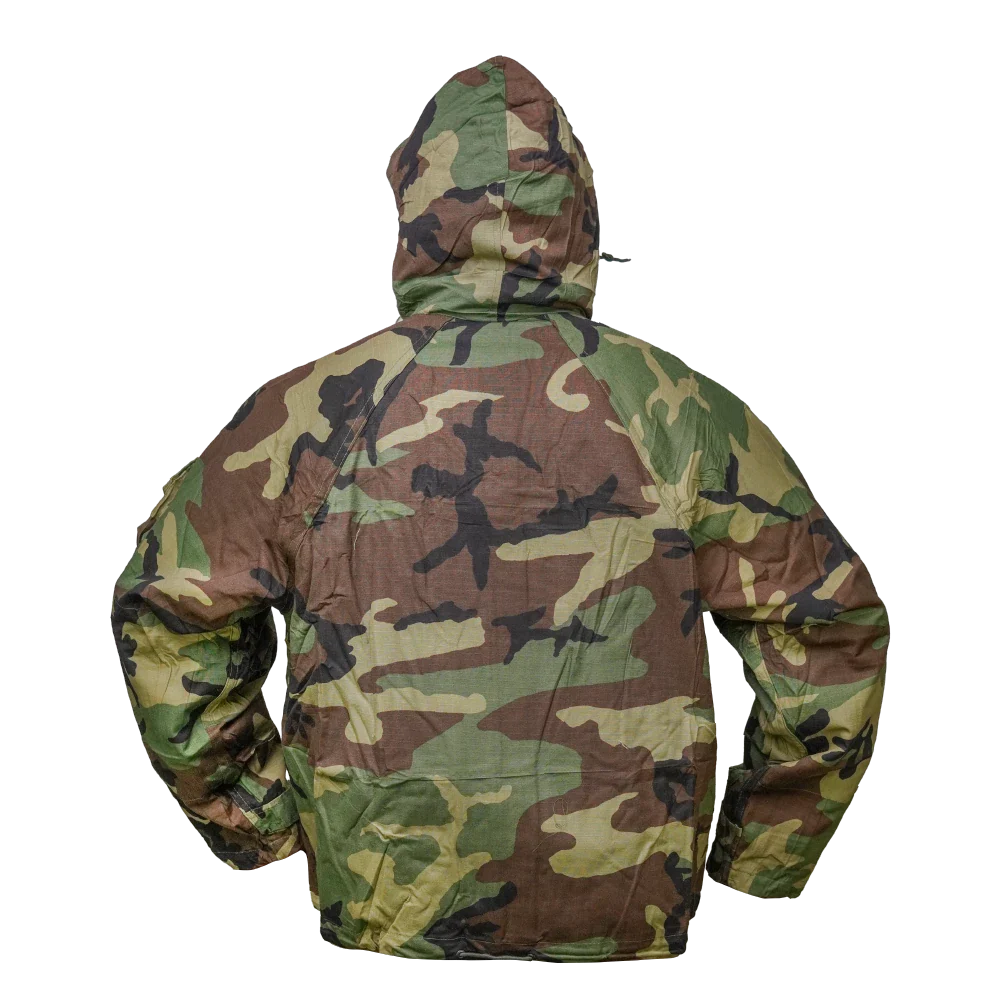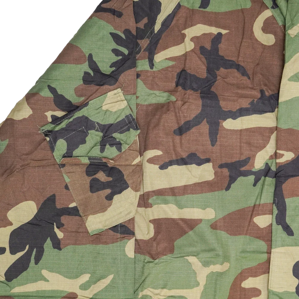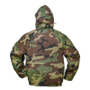 USGI Woodland NBC Jacket in Woodland camouflage. Constructed from a 50% nylon / 50% cotton outer shell with a protective liner. Features a full front closure with storm flap, integrated hood with drawcord adjustment, and adjustable cuffs.