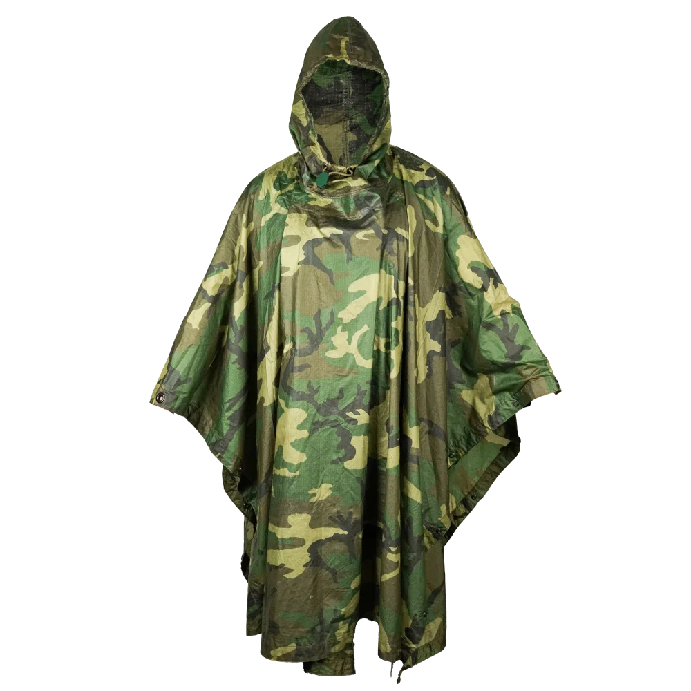U.S. Government Issue woodland camouflage poncho produced to U.S. military specifications. Lightweight construction with an integrated hood and water-resistant material.