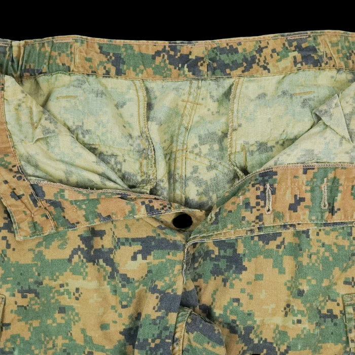 Surplus USMC FROG trousers in Woodland MARPAT camouflage. Features multiple storage pockets and a button fly with elasticated waist. Manufacture date is 2007.