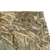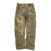 Commercial Wrangler Rugged Wear camouflage jeans from the 1990s. They feature a straight-leg cut and a traditional five-pocket layout in a woodland-style hunting camouflage pattern.