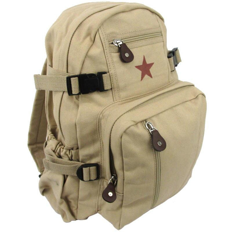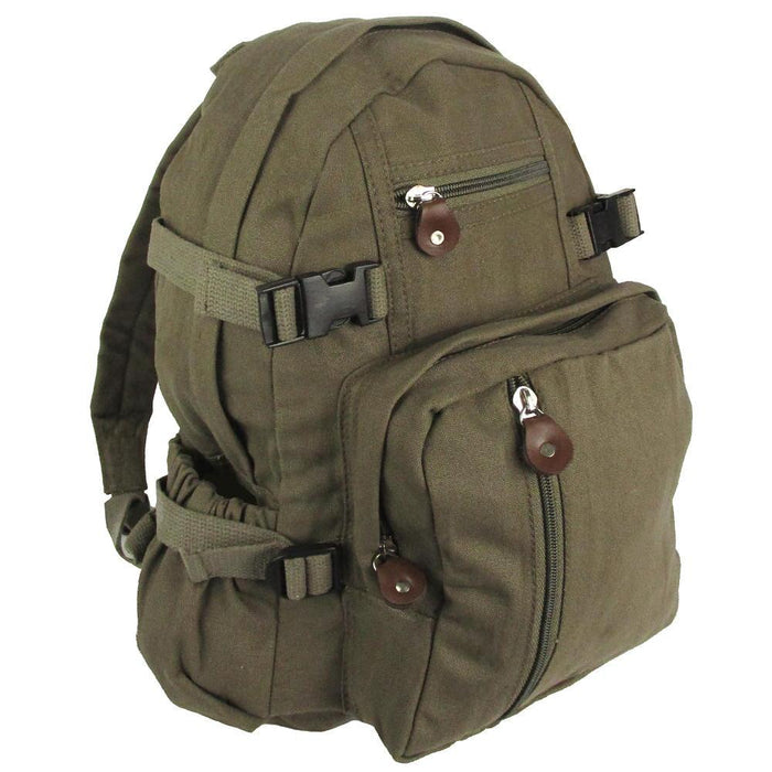 Rothco's canvas backpack combines a vintage look and feel with a compact design to survive a day in the modern life. Constructed from cotton canvas with leather accents and metal zips. A good size for carrying your gear to work, school or on day hikes.