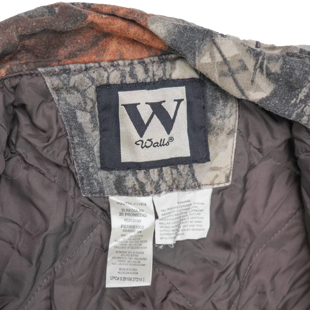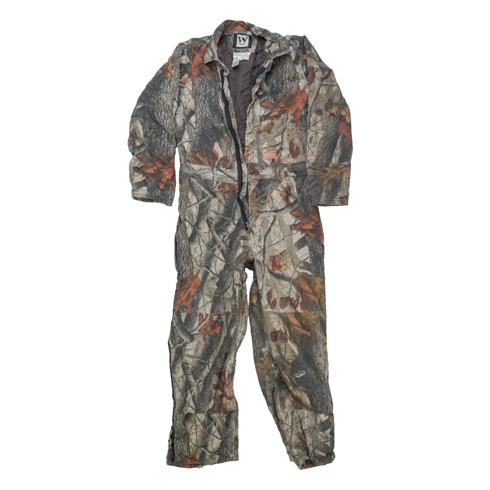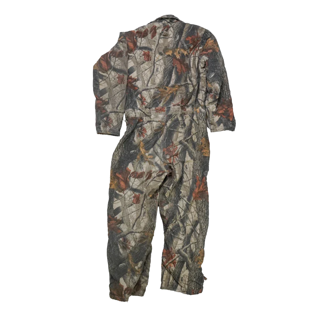 Walls Realtree camouflage lined coveralls in youth size 20. One-piece coverall garment with a camouflage outer and lined interior for added warmth.