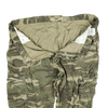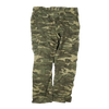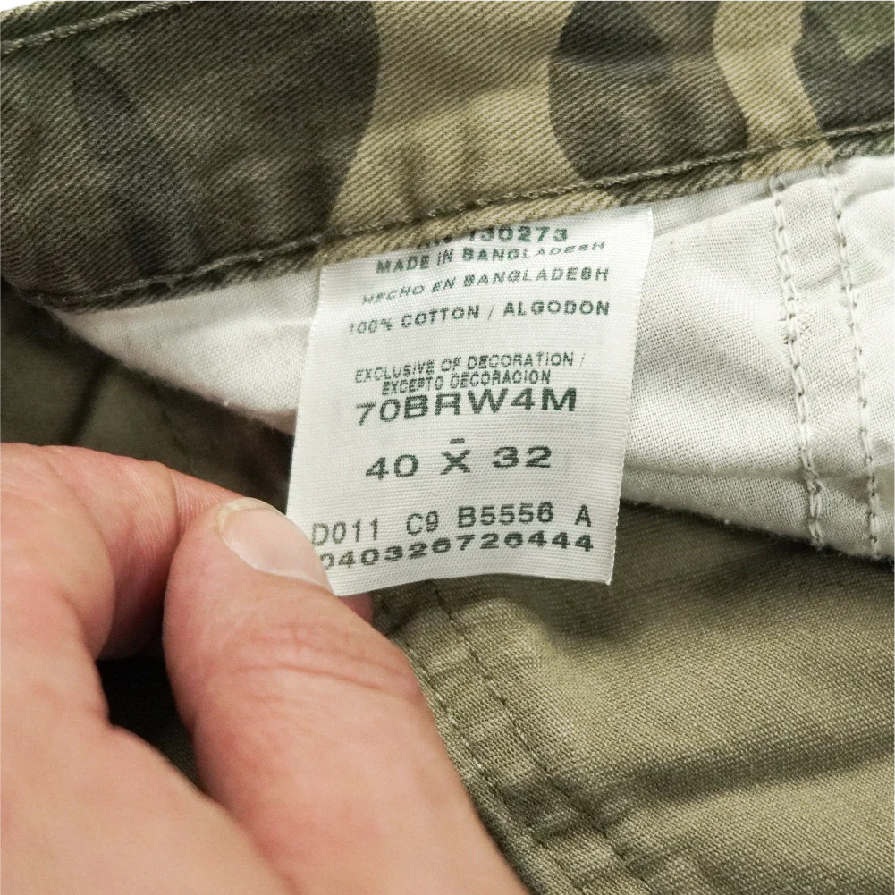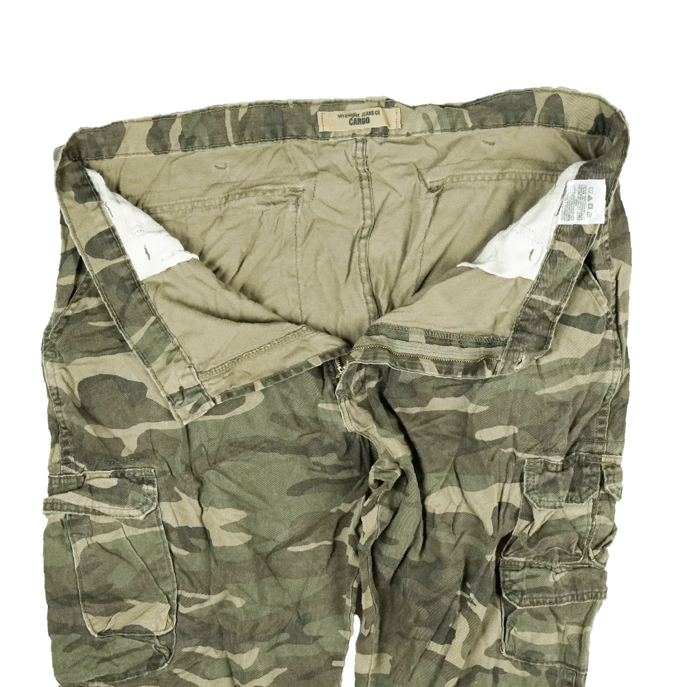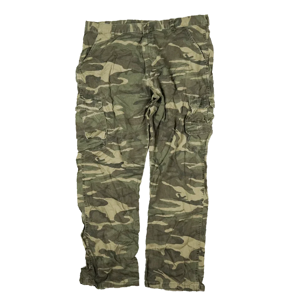 Commercial Wrangler cargo pants in a woodland-style camouflage pattern. This pair features a relaxed cargo cut with multiple cargo pockets and a cotton construction.