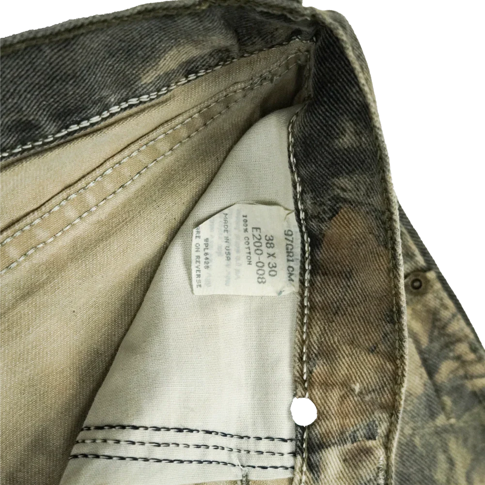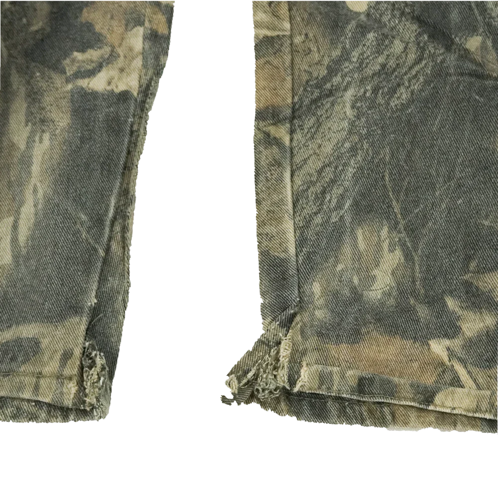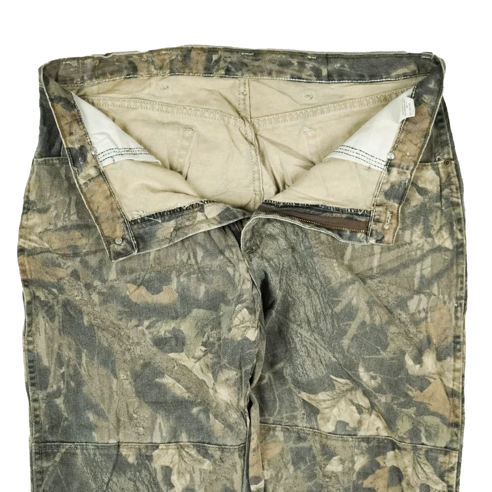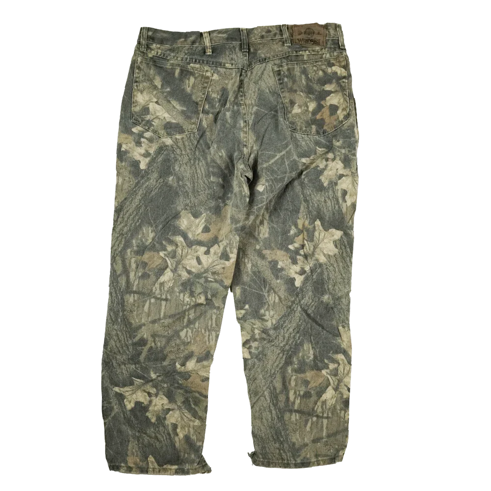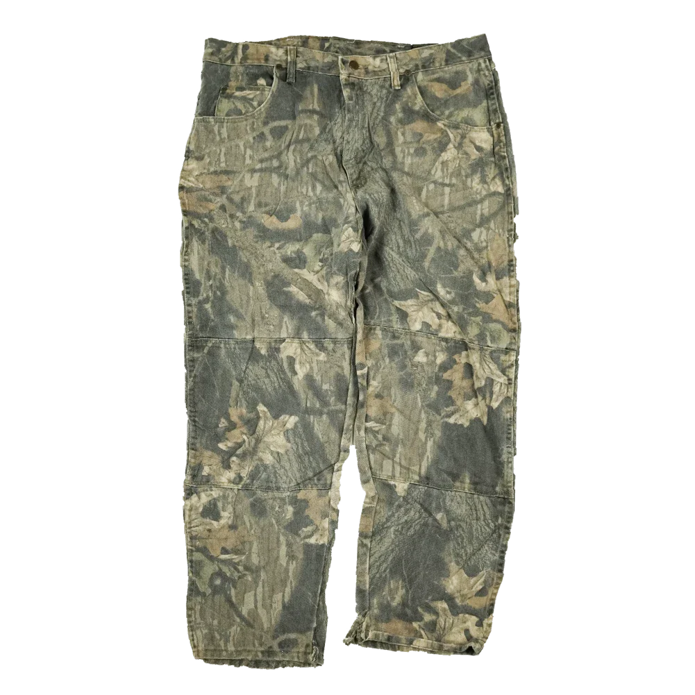 Commercial Wrangler hunting pants featuring a Mossy Oak camouflage print. These trousers have reinforced knee panels and a classic Wrangler workwear cut with belt loops and rear patch pockets.
