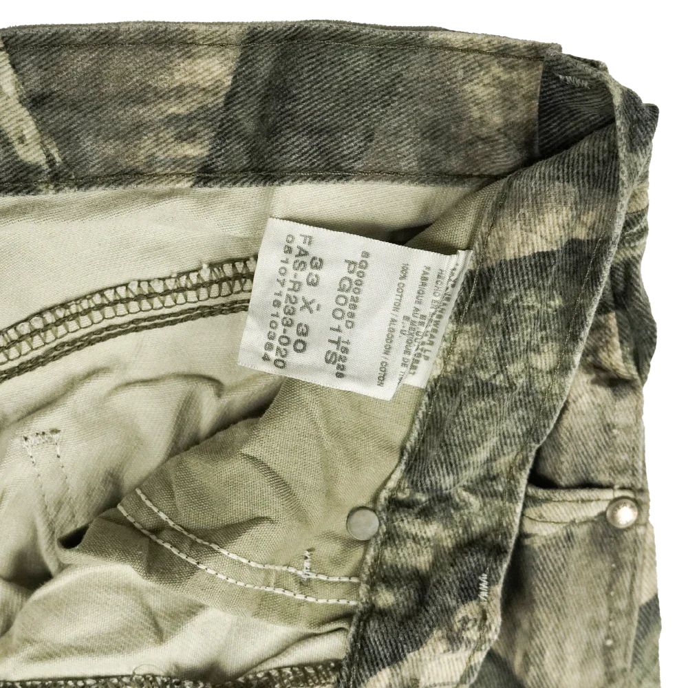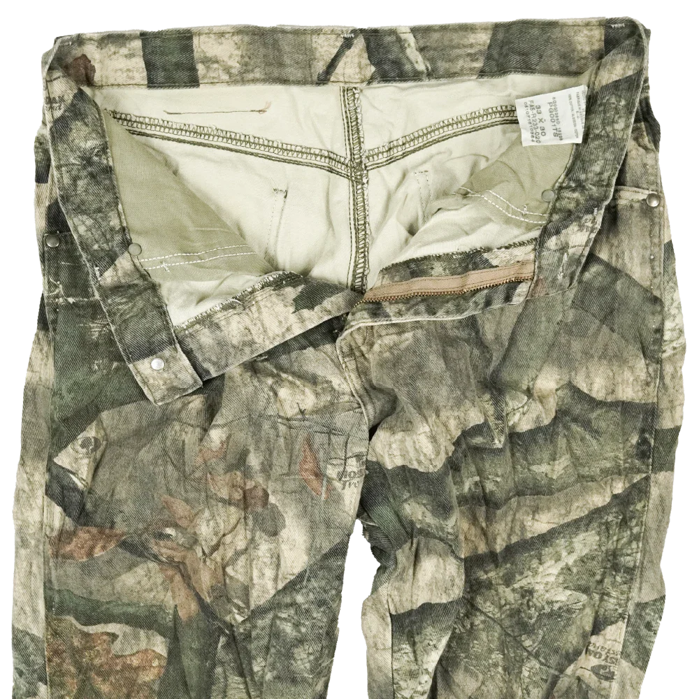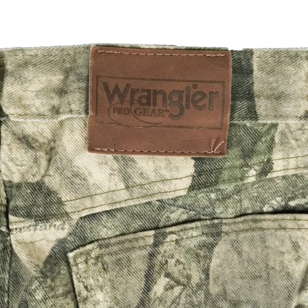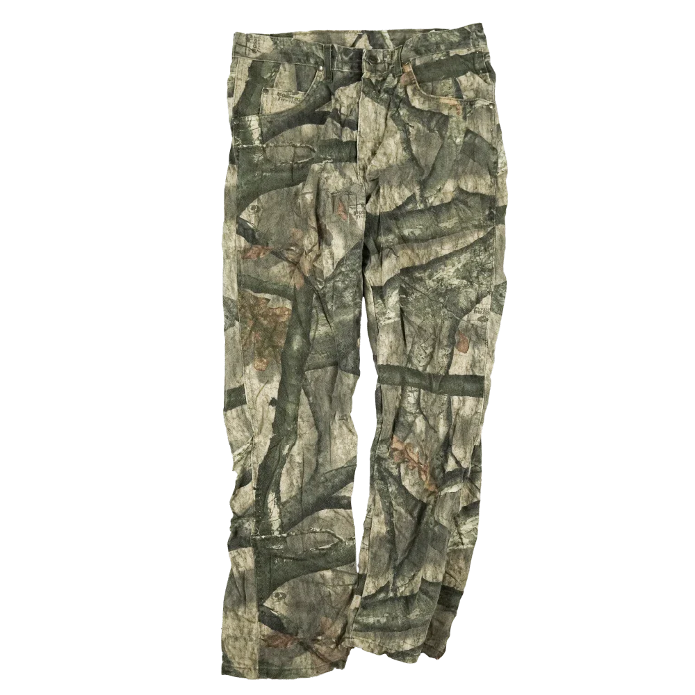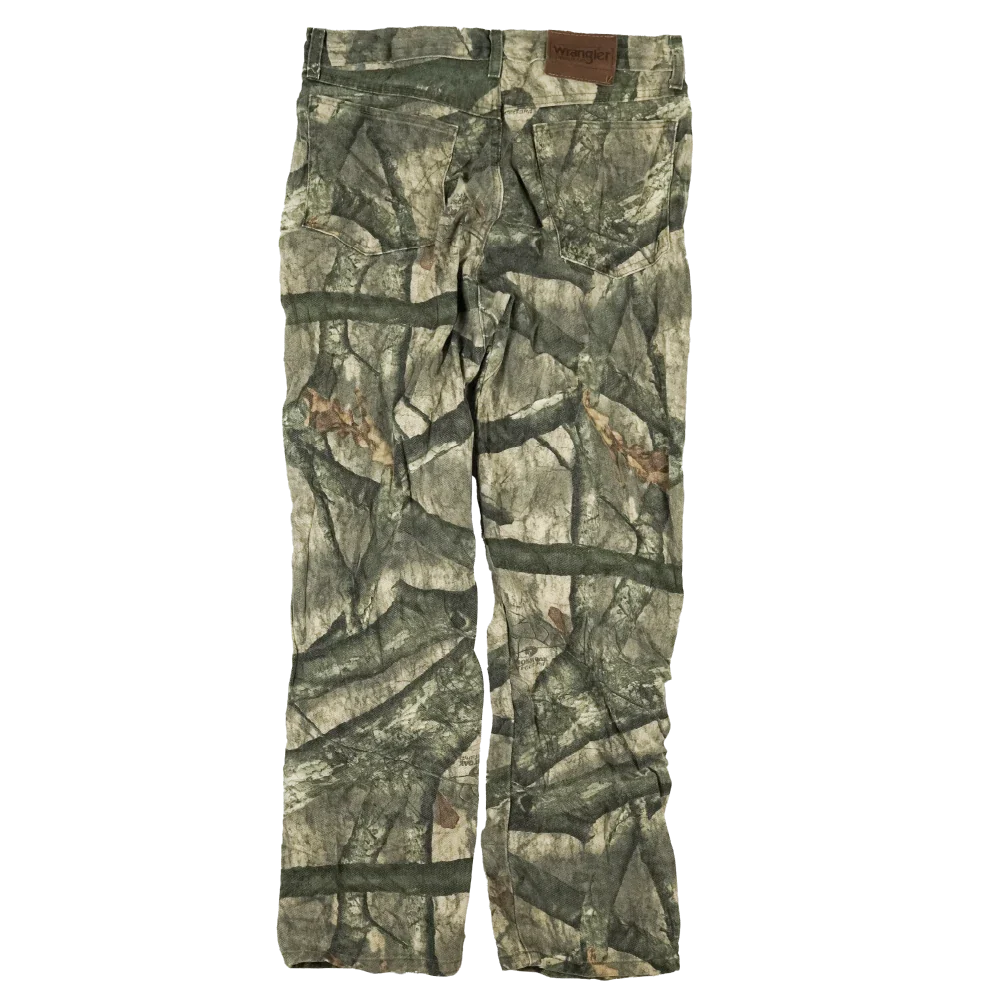 Commercial Wrangler hunting trousers in Mossy Oak camouflage. Plain construction with a straight trouser cut and standard waistband.