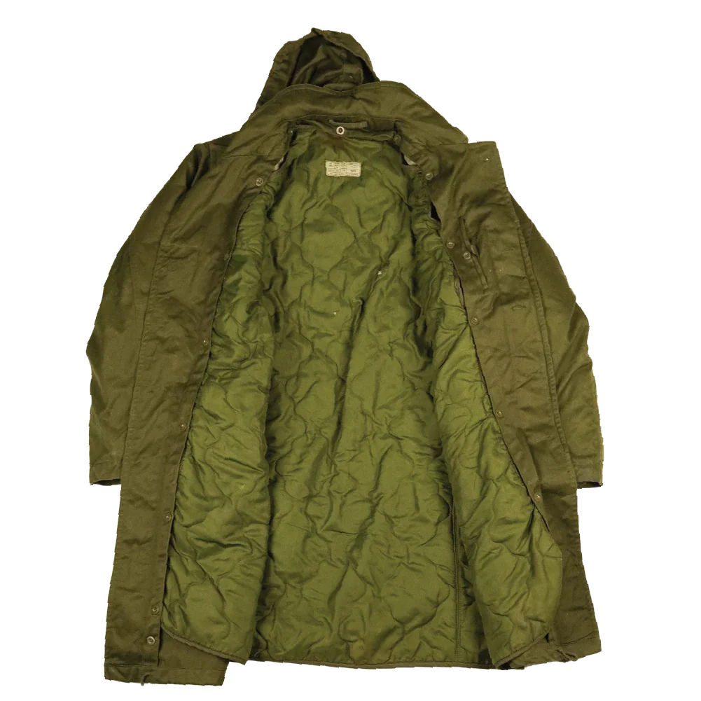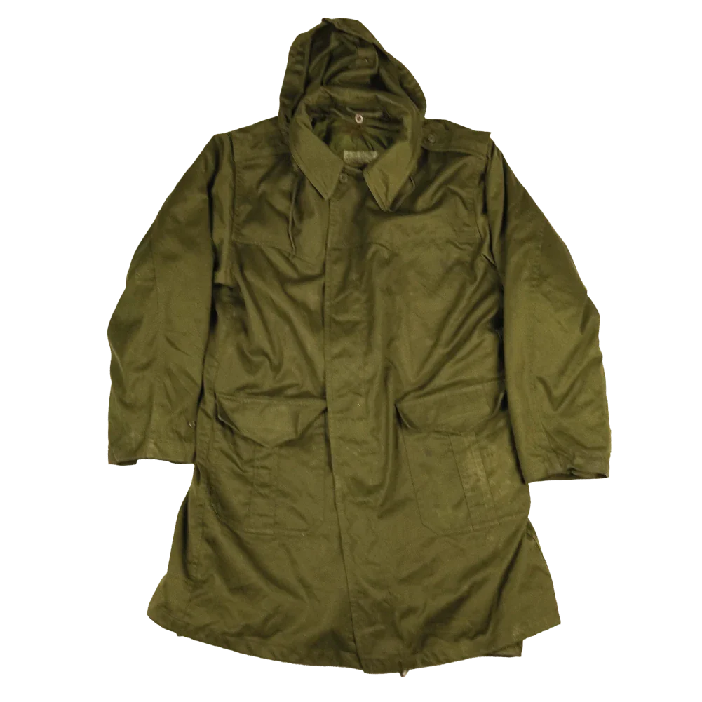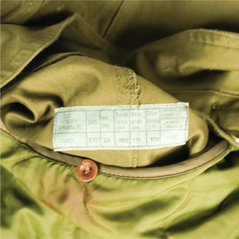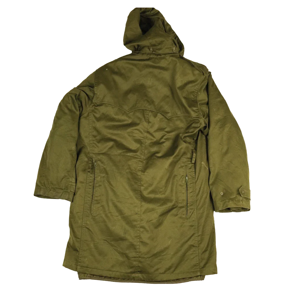 Cold weather parka of Yugoslavian surplus manufacture. Features an olive drab outer with a lined interior. Manufacture date is 1990.